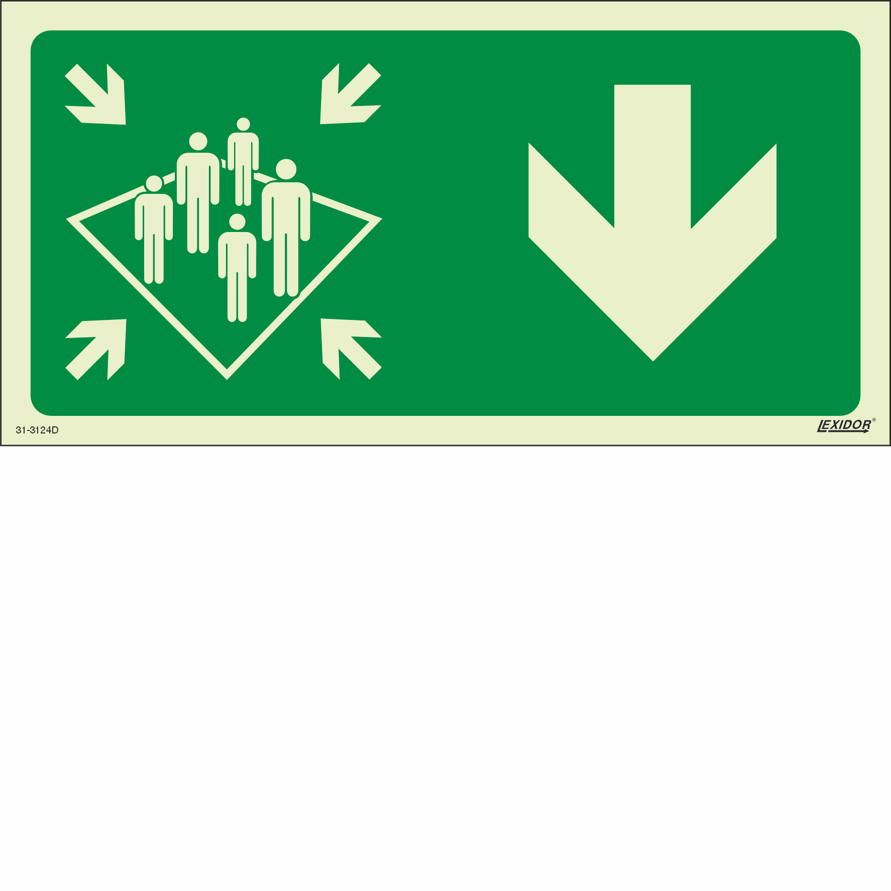 Means of escape signs which provide escape route identification to a safe area (assembly station / embarkation station).