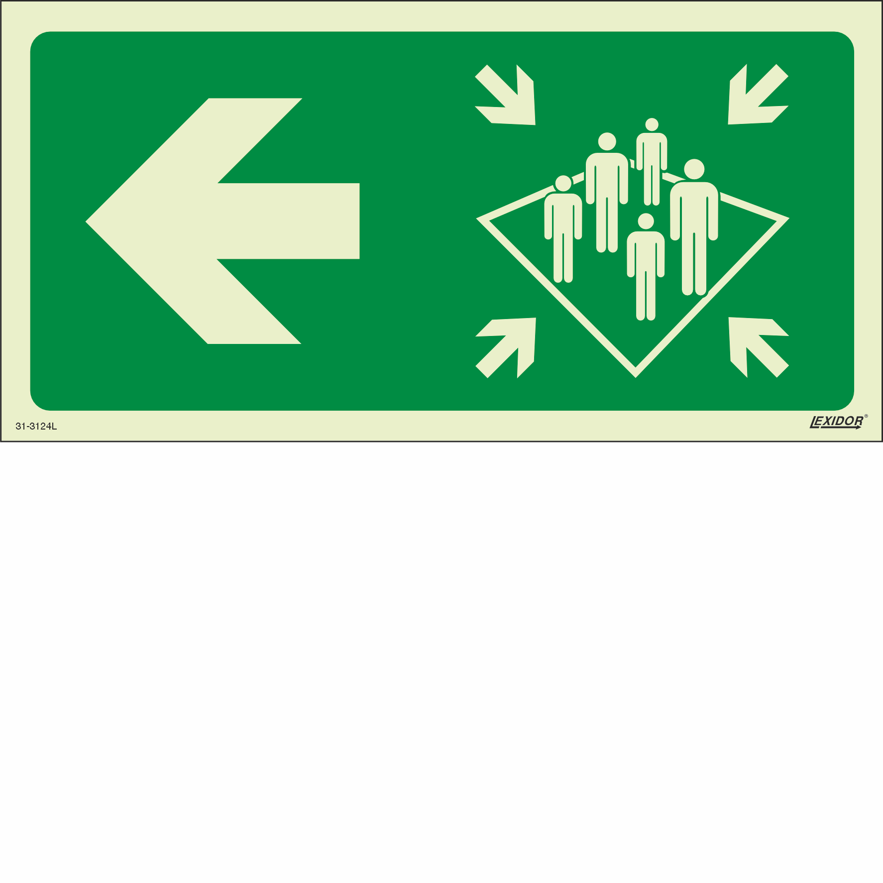 Means of escape signs which provide escape route identification to a safe area (assembly station / embarkation station).