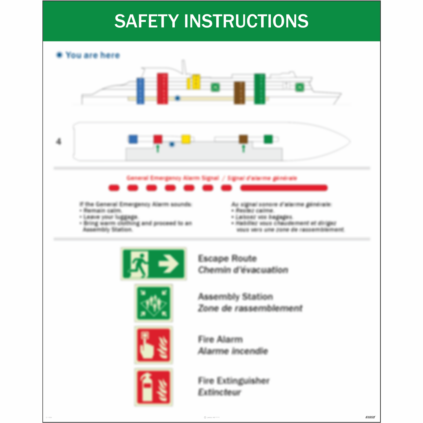 Emergency escape plans which display the layout of the facility/vessel, the location of escape routes, emergency exits, assembly stations, and provide clear instructions for evacuation procedures and lifejackets.
